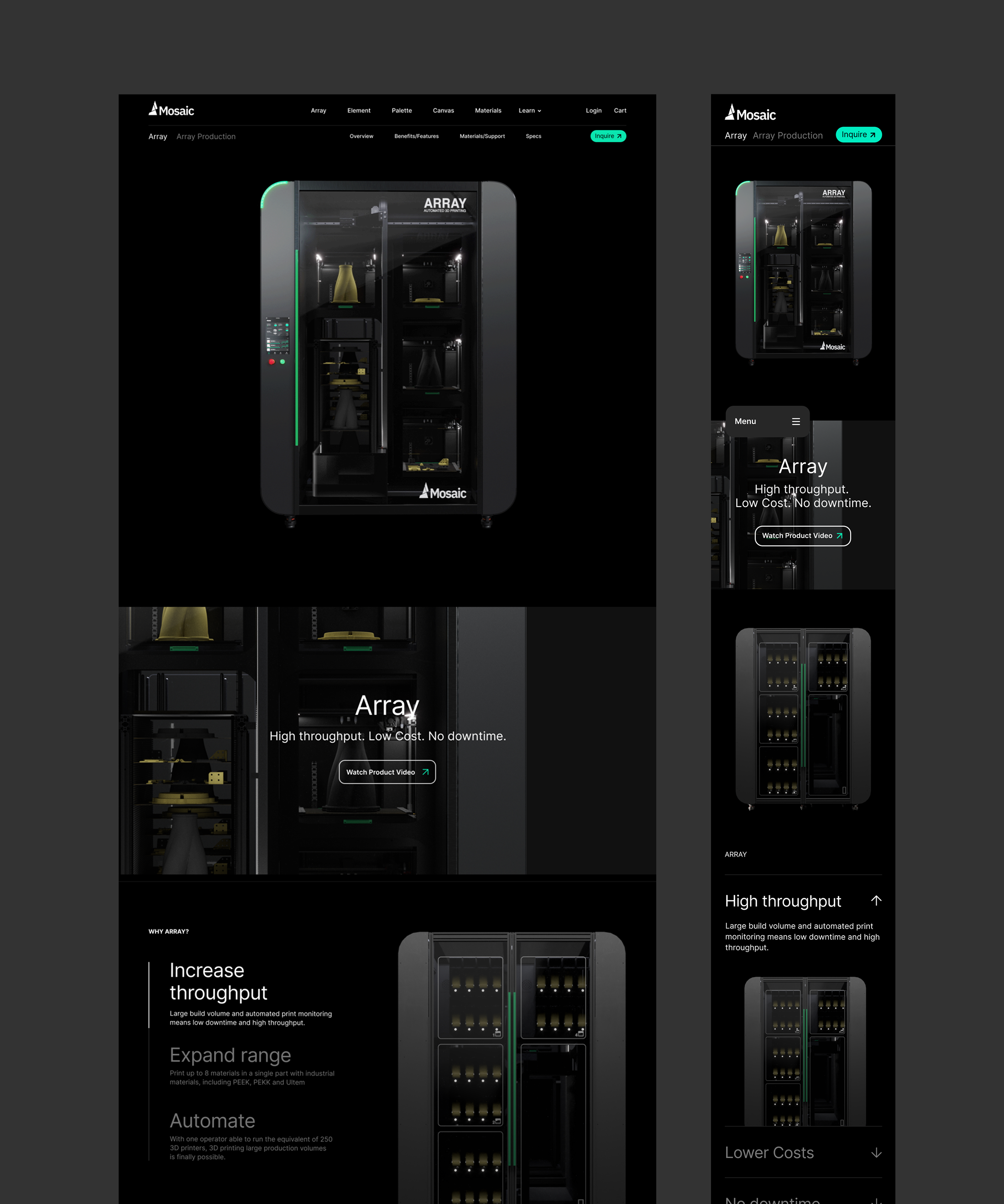 I led the design refresh of Mosaic Manufacturing’s Shopify experience to support the launch of a highly anticipated new line of 3D printers. Working closely with their 3D designer, I collaborated on integrating high-end product visuals and interactive assets into a cleaner, more premium web system. Beyond the core ecommerce flow, we expanded the site with supporting content — including case studies, solutions pages, and Apple-inspired product pages — to clearly communicate the product lineup, key features, and differentiation.